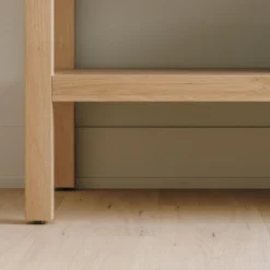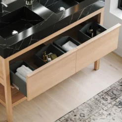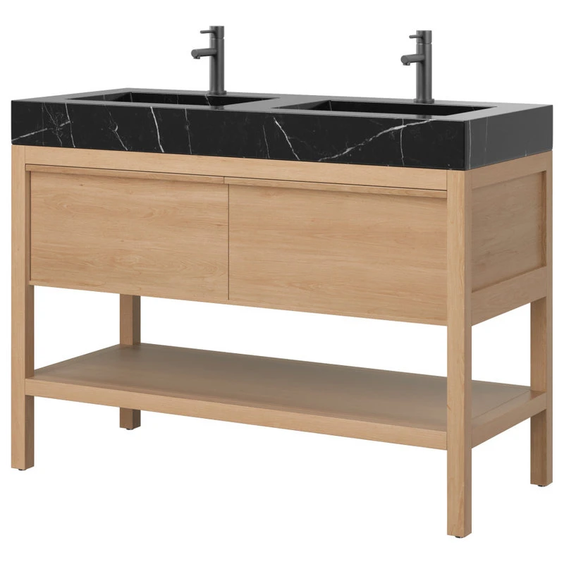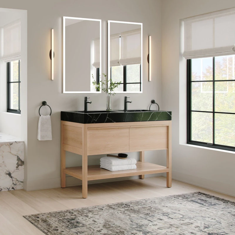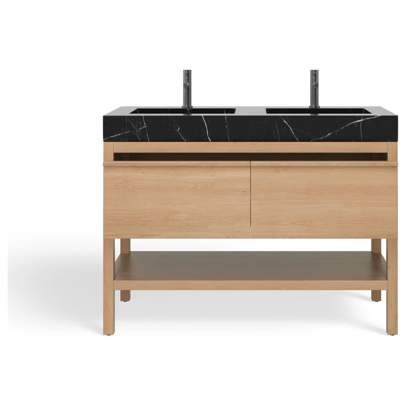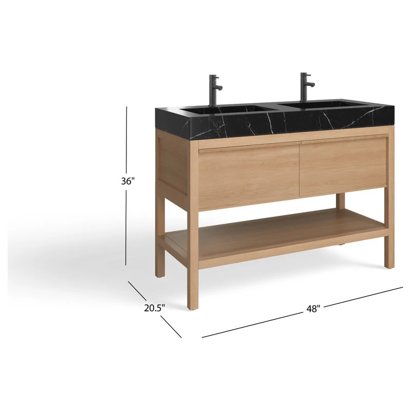 Sleek and understated, this 48-inch whitewash oak vanity will stand the test of time. The Bulgaria Gray Quartz top features recessed double-sinks and a delicate veining pattern laced within the light wood bringing movement to the eye. The handle-free drawers, smooth countertops and open shelving style are perennial and functional, living up to the ideals of the MOD brand.