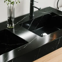 This item only includes vanity base, sink vessels, pop-up drain, and countertop. Faucets and decor purchased separately.