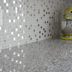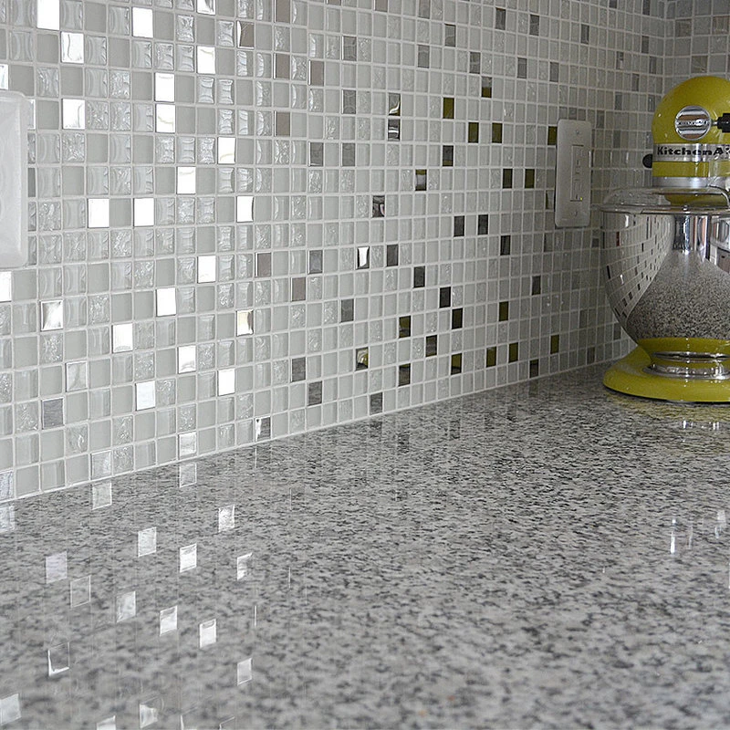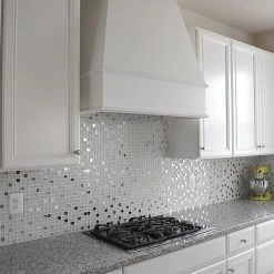 White glass tiles mixed with metal inserts. White color kitchen backsplash tile.