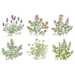 Salvia officianlis,(Common Sage) Rosmarinus officinalis, (Rosemary) Thymus vulgaris, (Garden Thyme) Lavandula angustfolia, (English Lavender) Chamaemelum nobile, (Roman Chamomile) Ocimum basilicum (Basil)
