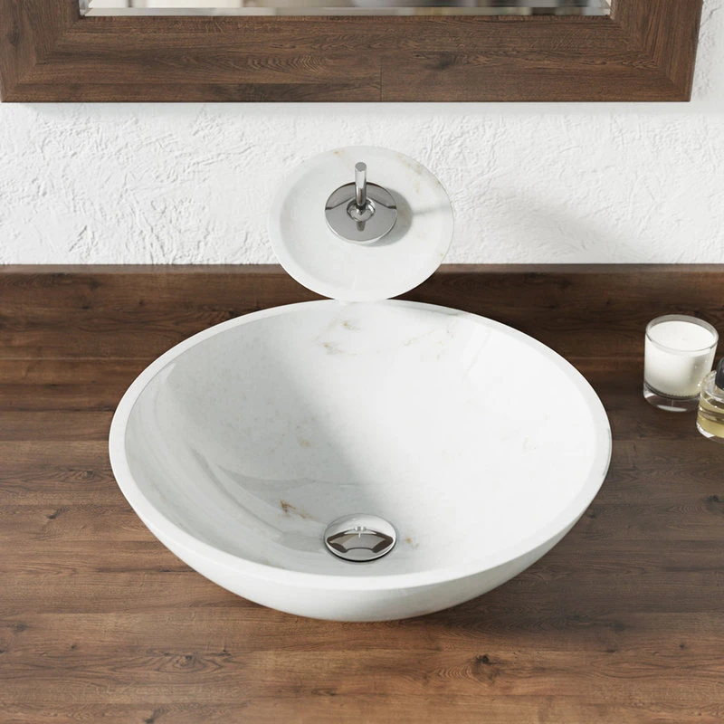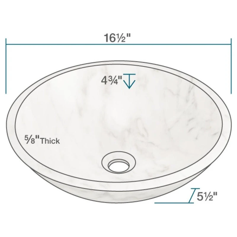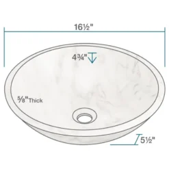 This circular, 5/8″ thick, white granite vessel is hand-polished to a high-gloss luster which accentuates the inner beauty of this stone. The mood of the room will turn elegant and earthy when this rock solid choice is installed in the bath. With an overall measurement of 16 1/2″ x 16 1/2″ x 5 1/2″, it will require a minimum-width cabinet of 18″. This listing does not include any accessories.