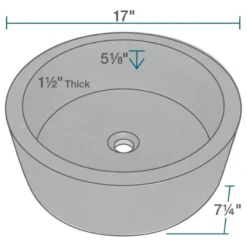 Similar to basaltic lava rock, this honed, matte-black, granite vessel has a cylindrical shape and overall thickness which gives it an unmistakeable presence in the bath. Its interior is perfectly round and flat, with a 1 1/2″ rim that becomes thinner as it slopes slightly downward from back to front. With an overall measurement of 17″ x 17″ x 7 1/4″, it will require a minimum-width cabinet of 18″. This listing does not include any accessories.