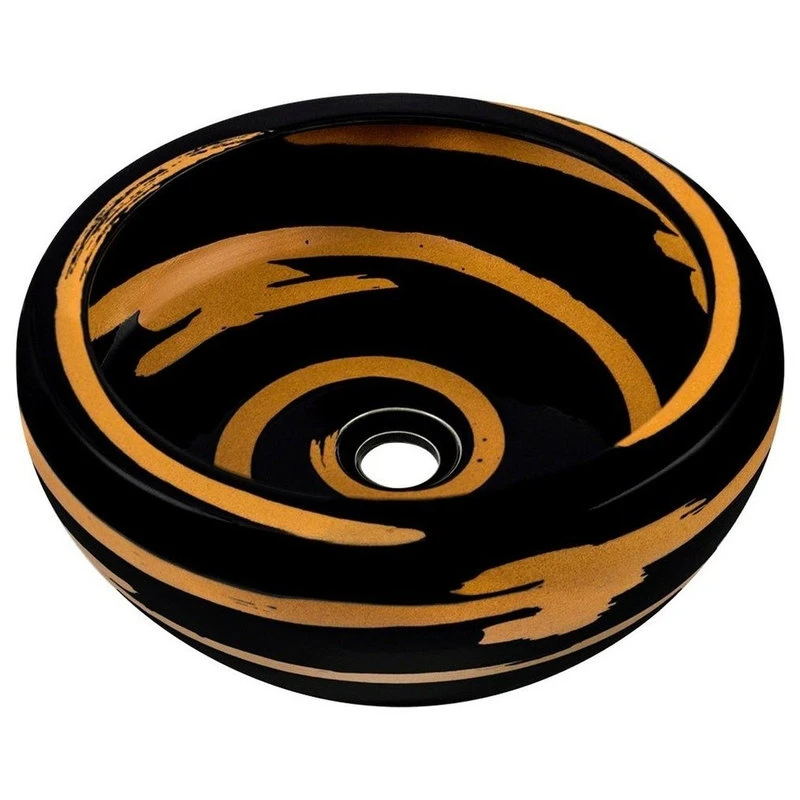 The exciting design of this vessel sink is formed on the potter’s wheel by the hands of a gifted artist. Premium clay, fired at extreme temperatures makes this a solid choice. The bold black bowl is highlighted by dramatic rough strokes of deep yellow, and features a rim that gently folds into its interior. Its flattened base means no additional mounting hardware is required. With an overall measurement of 16 1/4″ x 16 1/4″ x 6″, it will require a minimum-width cabinet of 18″. This listing does not include any accessories.
