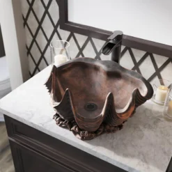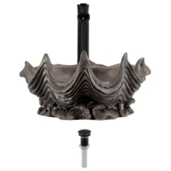Constructed of pure bronze, this oceanic-themed vessel sink takes the form of an open clamshell. Its exterior has a very detailed, simulated clam surface; while the interior is buffed smooth. An initial patina finish is baked into this sink, then, like copper, its natural patina, provides ever-changing charm over time. With an overall measurement of 19 1/2″ x 15 3/4″ x 9″, it will require a minimum-width cabinet of 21″. The 731-ABR , single-handle, vessel faucet reaches a height of 12 1/4″ and features a classic trough-style spout with a 4″ reach. Its sleek lines gradually widen and contract to create a stunning design statement. The single handle has a flat top with an inverse curve below to mimic the spout design; and it easily sets just the right water flow and temperature. Ceramic disc cartridges assure long-term, dependable operation, and a beautiful antique bronze finish completes its distinctive appearance. The faucet is constructed without lead and is compliant with NSF (National Sanitation Foundation) standards, the Safe Drinking Water Act, the cUPC (Uniform Plumbing Code of the United States and Canada), the ADA (American Disabilities Act) and carries the EPAs WaterSense label. Additionally, a spring-loaded, vessel pop-up drain (vpud) is included, which opens and closes with a simple press to its attractive antique bronze cap.