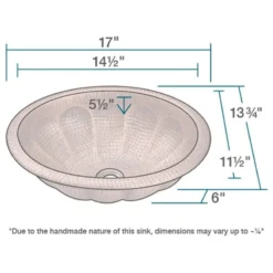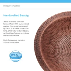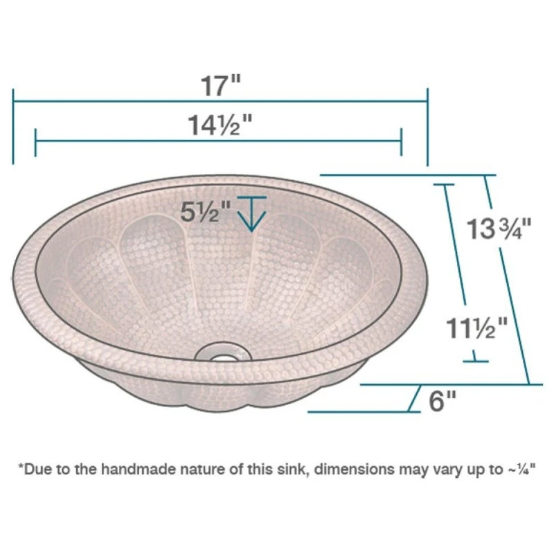 It’s like taking a step back in time to the baths of the ancients when the MR Direct 921 copper sink is on display. This distinctive oval bowl is crafted by the hands of fine artisans. Not only does it feature the same encompassing pattern of hand-hammered dimples that many other MR Direct copper sinks possess; but it also exhibits an impressed scallop pattern visible around the interior and exterior of the sink. The 921 is designed for topmount installation. It is constructed from a single piece of 99% pure mined copper; and its appearance will change over time as oxidation slowly produces a surface coating known as a patina. This effect is usually a major incentive for purchasing a copper sink, therefore MR Direct does not use any lacquers or waxes which could temporarily impede its development. With an overall measurement of 17″ x 13 3/4″ x 6″, it will require a minimum-width cabinet of 18″. Additionally, a grid drain (gd) is included, which allows water to pass through while catching solid debris with its attractive antique bronze cap.