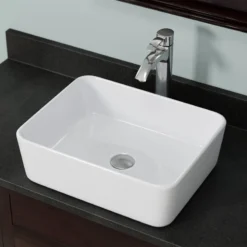 Simple and unassuming, this rectangular vessel sink is full of practicality. Its thin sides subtly angle up and out from its level bottom. And, surrounded by gently curved corners, a spacious interior with plenty of length, width, and depth is provided. The additional vitreous china coating on this model creates an even more impervious and sanitary surface than standard porcelain. With an overall measurement of 18 1/8″ x 14 1/8″ x 5 7/8″, it will require a minimum-width cabinet of 21″.