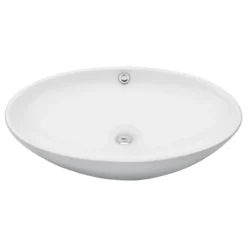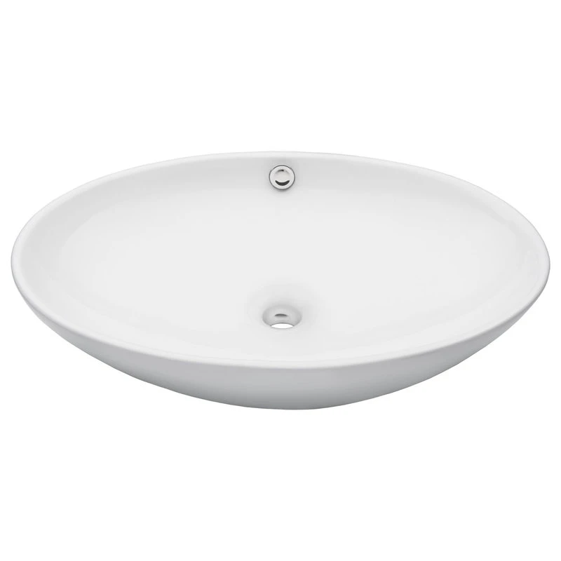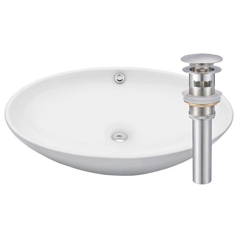 - Oval white glossy porcelain vessel sink and solid brass overflow pop-up drain with brushed nickel finish