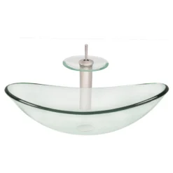 Harmonize and upgrade your bath with Novatto’s clear glass vessel and matching brushed nickel waterfall faucet. Novatto uses advanced technology, including computerized glass processing and Italian furnaces, giving our glass basins unmatched structural integrity. This vessel sink and faucet combo is a great way to harmonize the decor by unifying color and textural design of the bathroom. The matching faucet disc directs the water flow into a graceful waterfall. Each glass sink and faucet features its own beauty of color, structural character and texture adding a sense of purity, elegance and distinctive look to any design.