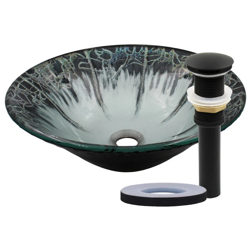 The Credere vessel sink is strikingly beautiful. From Novatto’s exclusive hand painted vessel collection, it adds a touch of style to any bath. This glass vessel will enhance and harmonize the look of your bath by unifying color and textural design. Constructed of high tempered glass, this round vessel sink has a unique hand-painted design of blue and grey with some sparkle. Novatto uses advanced technology, including computerized glass processing, to produce glass basins with unmatched structural integrity and longevity. The sink has a standard 1.75-inch drain opening. The set includes a matte black pop-up drain and mounting ring.