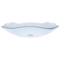 - Scalloped clear glass vessel sink with 1.5 inch solid brass pop-up drain, mounting ring and Glacier Ice Sealer