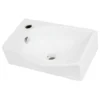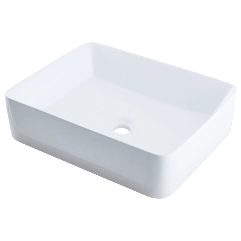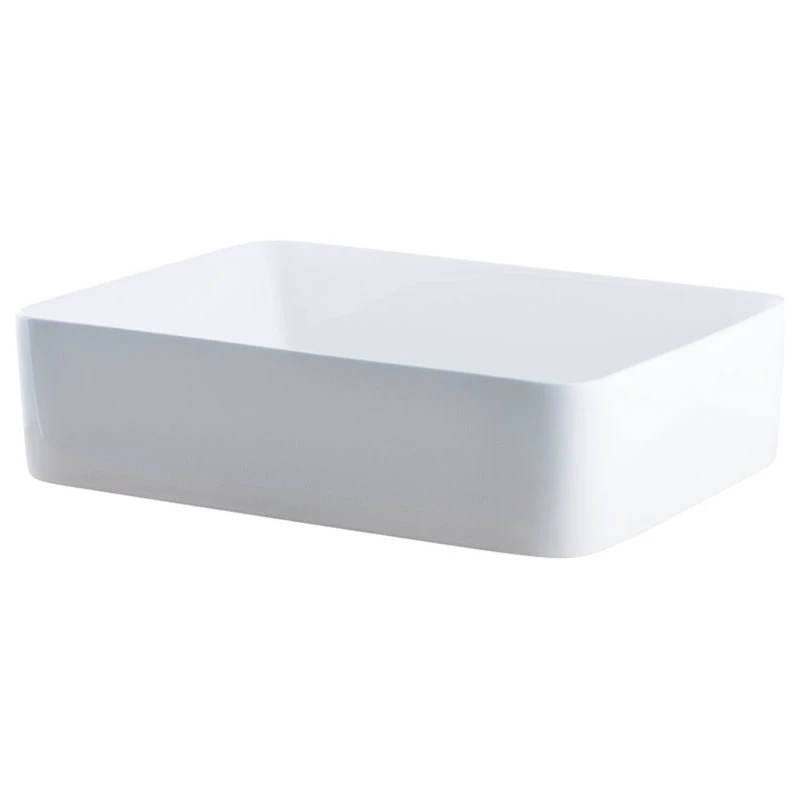 - Rectangular bright white glossy ceramic vessel sink with no overflow