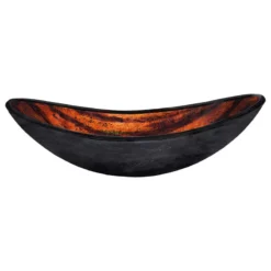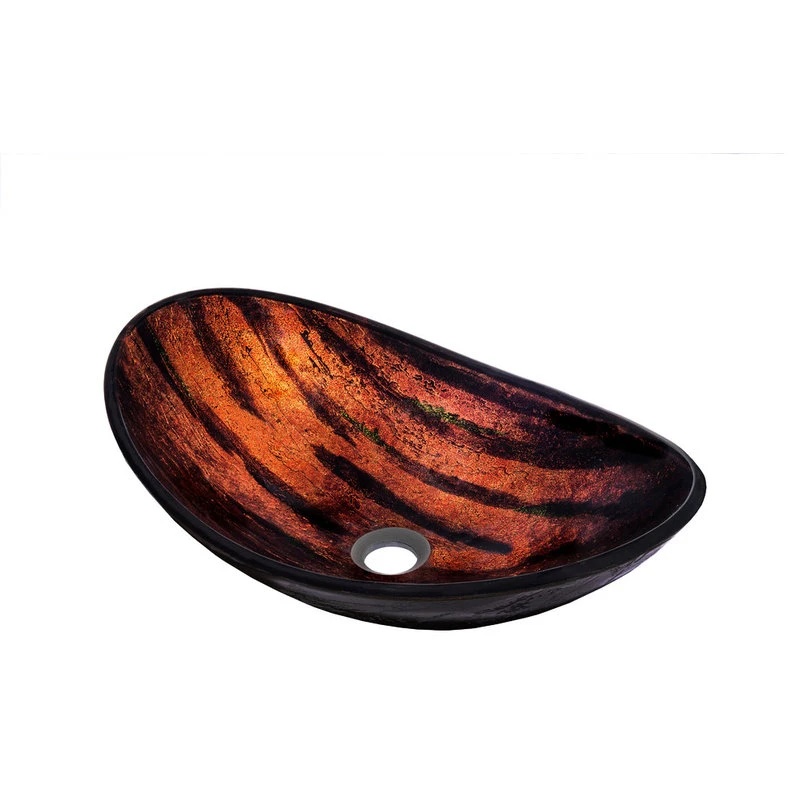 Volle, from the exclusive hand painted vessel collection of Novatto, adds a touch of style to any bath. Constructed of high tempered glass, this slipper sink has a unique hand painted camouflage design of brown and copper. Novatto uses advanced technology, including computerized glass processing, to produce glass basins with unmatched structural integrity and longevity. Volle has a standard 1.75-inch drain opening and includes a brass pop-up drain finished in oil rubbed bronze and a matching mounting ring.