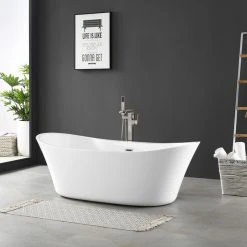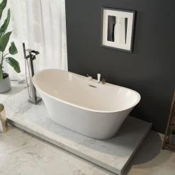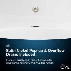 Stretch out and enjoy the generous soaking capacity and cushy leg room of the Jacky 69-inch long freestanding slipper bathtub by OVE Decors. Holding over 60 gallons of water, with lightweight high gloss white seamless acrylic construction that keeps your bubble baths comfortably warm, the Jacky features gently sloped backrests on either end perfect for kicking back and relaxing. A side mount satin nickel pop-up drain empties the tub quickly, while hidden self-levelling feet easily accommodate uneven floors.