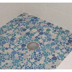 We create our Porcelain Sea Mist Pebble Tile by firing ceramic pebble shaped pieces in various sizes. The porcelain pieces are adhered to a durable mesh backing to make these mosaic floor tiles easy to install.