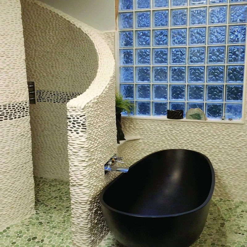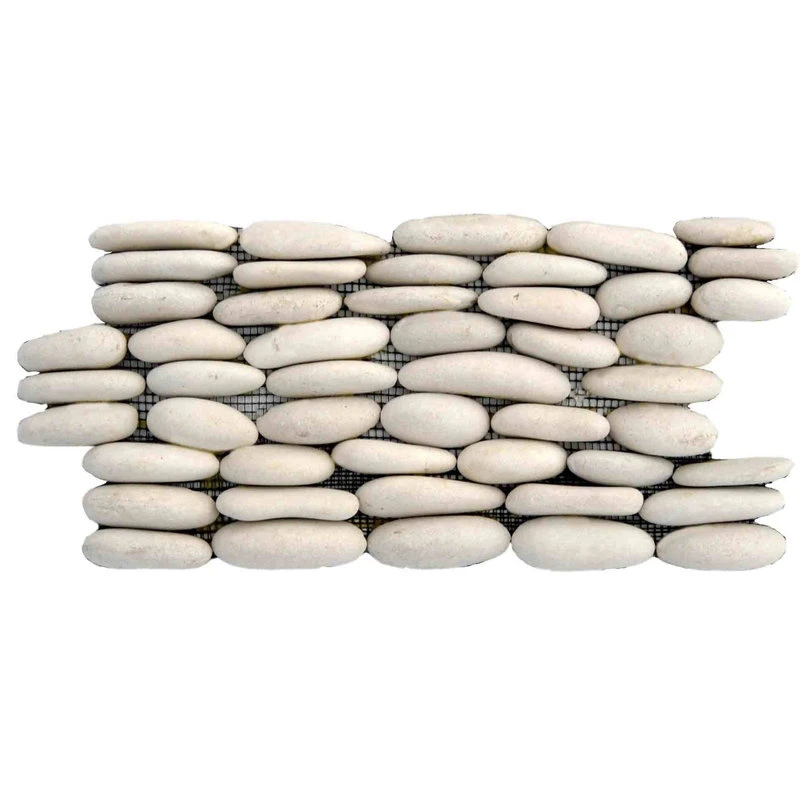 We create our Standing Ivory Pebble Tile from the stones used in our Natural Pebble Tile line. Each stone is cut in half and adhered to a durable mesh backing for ease of installation. Our unique interlocking system gives the appearance that each stone is hand set.