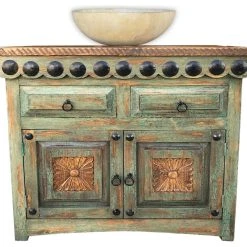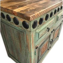 - This beautiful southwestern vanity is hand crafted with kiln-dried solid wood, double doweled at joints. Crackel Turquoise finish detailed with hand made carving on panel. Reclaimed wood on top, covered with polyurethane.
