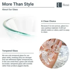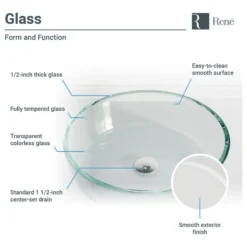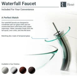 Only extra-thick, tempered glass is used in its manufacture. High temperatures will not mar it in any way. Good hygiene comes naturally, as glass is non-porous. Staining or retention of odors is unheard of. Clean up is simple. It measures 16 1/2″ x 16 1/2″ x 4 1/2″, and is guaranteed to remain functional and engaging for life. The waterfall-style faucet is soundly constructed of premium-quality, solid brass components. The disc encircling the spout is formed from the same material as the basin below. Gracefully bending over the basin is a curved shaft topped with a toggle control handle. With a simple press to its handsome dome; the included, spring-loaded, vessel pop-up drain can be opened or closed.Rene R5-5013-WF Bathroom Combo Includes: