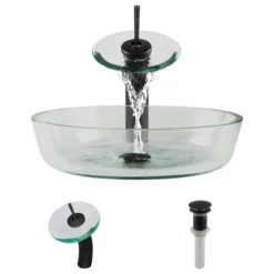 Only extra-thick, tempered glass is used in its manufacture. High temperatures will not mar it in any way. Good hygiene comes naturally, as glass is non-porous. Staining or retention of odors is unheard of. Clean up is simple. It measures 16 1/2″ x 16 1/2″ x 4 1/2″, and is guaranteed to remain functional and engaging for life. The waterfall-style faucet is soundly constructed of premium-quality, solid brass components. The disc encircling the spout is formed from the same material as the basin below. Gracefully bending over the basin is a curved shaft topped with a toggle control handle. With a simple press to its handsome dome; the included, spring-loaded, vessel pop-up drain can be opened or closed.Rene R5-5013-WF Bathroom Combo Includes: