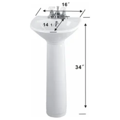 - This bathroom pedestal sink is cUPC, ANSI and ASME Compliant DIMENSIONS – Overall: 34″ Tall x 16″ Wide x 14″ Proj.
