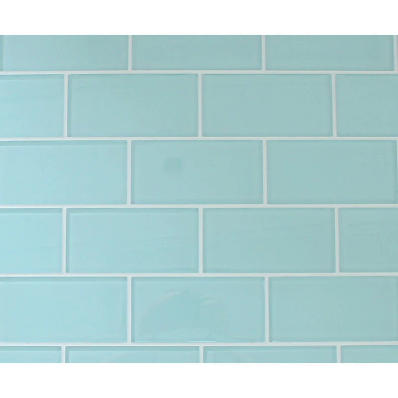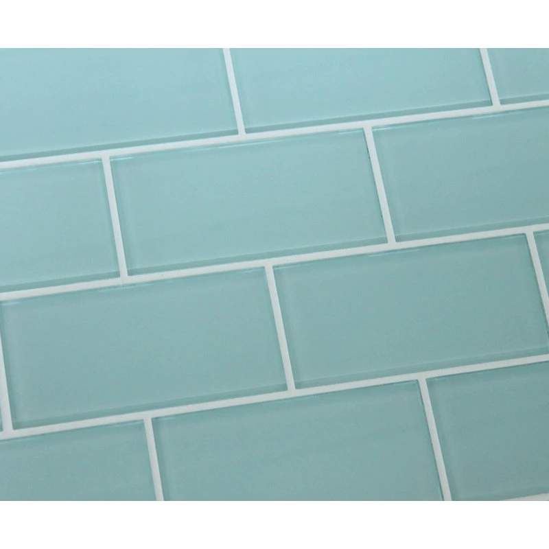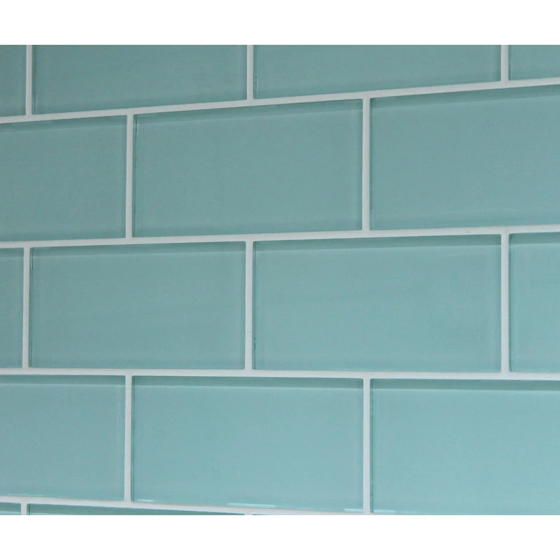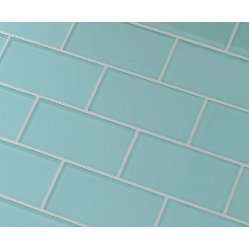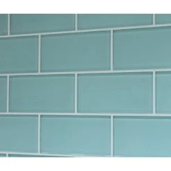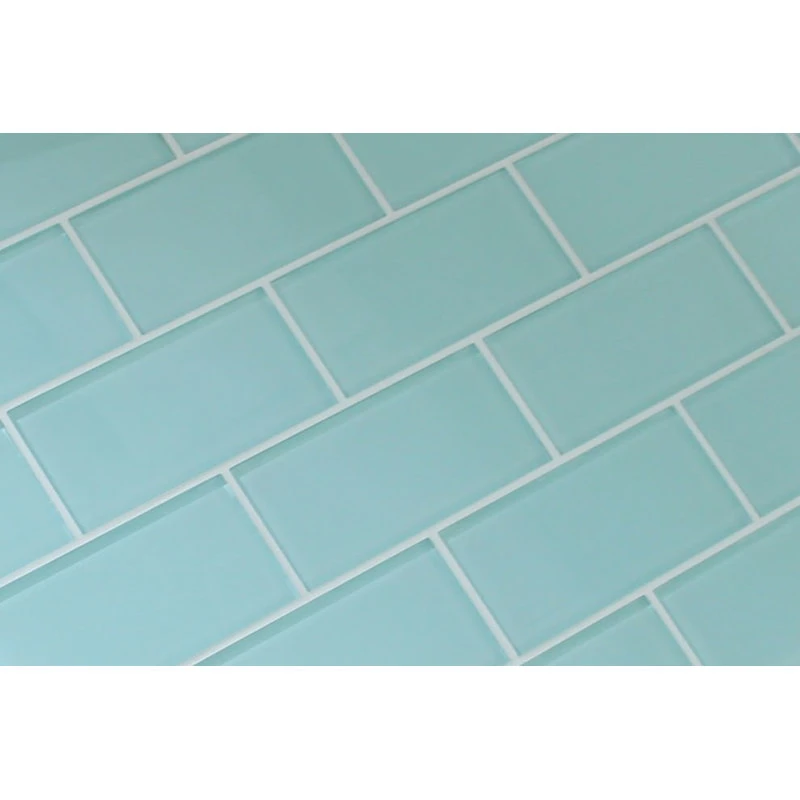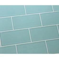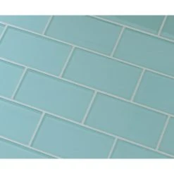 A light Seafoam green color 3×6 glass subway tile. A great choice for a tub surround or kitchen backsplash! This is a very soothing color. These tiles are sold loose packed giving you the option to install them in the pattern of your choice.