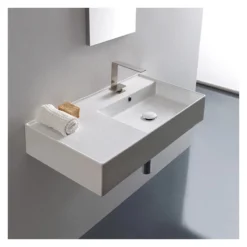 Perfect for the modern or contemporary bathroom atmosphere, this 32 inch bathroom sink is made from built-to-last white ceramic. It comes in the one hole option and can be either wall mounted or vessel installation. It was made in Italy by Scarabeo as part of their Teorema 2.0 collection,