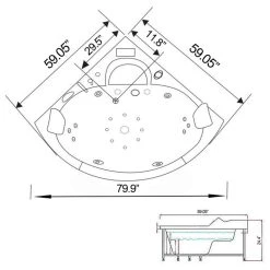 - Bath tub size: base 59,05″ L x 59,05″ W x 26″ High