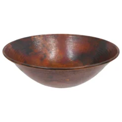 SimplyCopper 14” Round Copper Bowel Sink in Natural Fire Patina, created of 18-gauge copper which is hand-hammered to provide a Rustic, Old-World Look. This copper sink is installed as a vessel. Note: This sink has intentional worn areas in the copper to create an antique look. These variations and imperfections are by design. Close up pictures are provided. Please look at them. Any imperfections found on this sink are part of its design and should not be looked at by the buyer as a defect.
