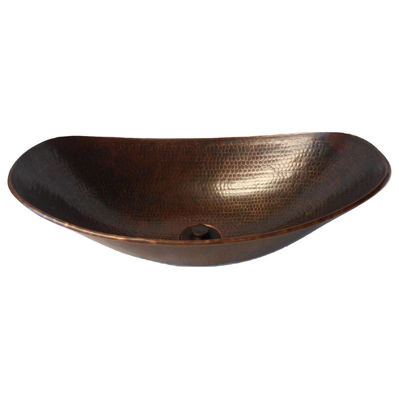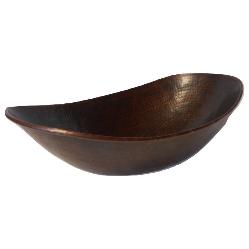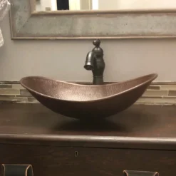 SimplyCopper 18″ x 11-1/2″ oval Canoa design is a unique design piece, created of 17-gauge copper which is hand-hammered to provide a elegant look. The finish is done by firing a dark patina, then brushing to highlight the undertones of copper in the sink. This sink is installed as a vessel.
