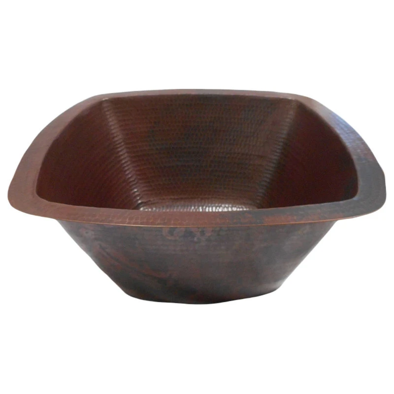 SimplyCopper 15” Square design, created of 18-gauge copper which is hand-hammered to provide a rustic antiqued look. This copper sink can be used as either a drop in or an under mount.