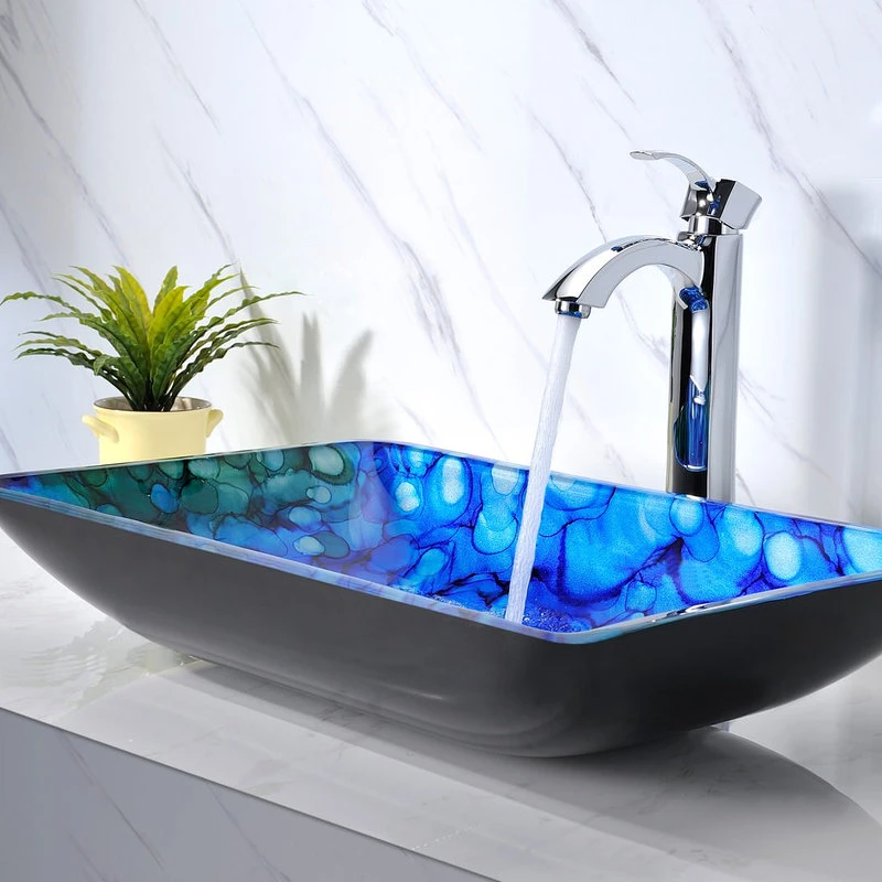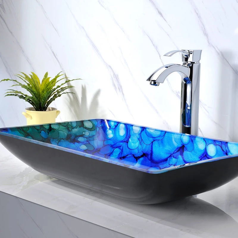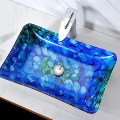 The ANZZI Avao Series sink is a traditionally crafted rectangular vessel sink adorned in a Lustrous Blue Finish. Each ANZZI vessel sink is formed using RHINO ALLOY certified high tempered Deco-Glass material. The result is a dynamically shaped and captivating vessel centerpiece for any bathroom counter.
