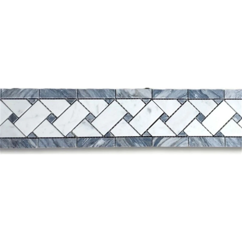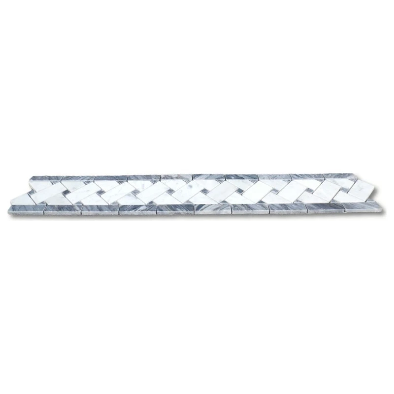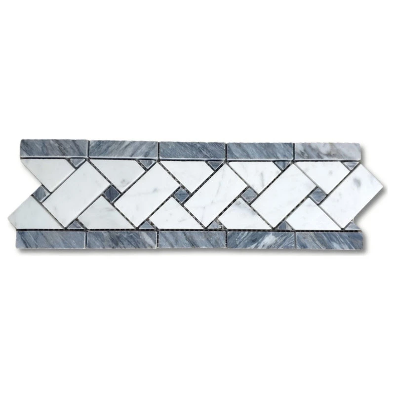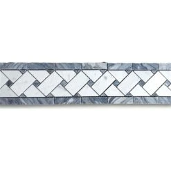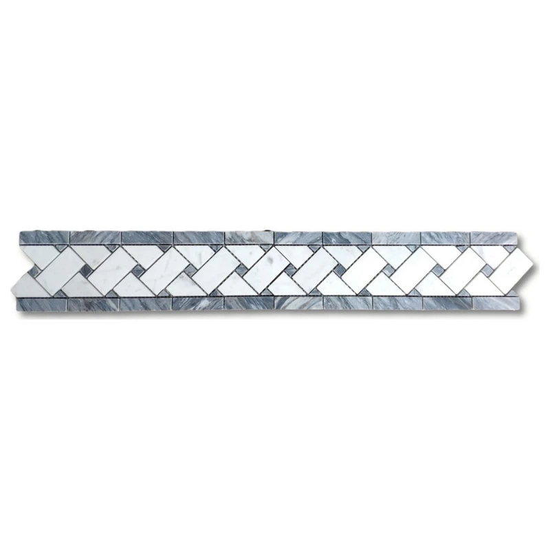 Premium Grade Basketweave White Carrara Marble Border Tile. Italian Bianco Carrera White Venato Carrara Polished 4 x 12 Basket Weave Mosaic Border with Dark Gray Bardiglio Dots Listello Tiles are perfect for any residential / commercial projects. The Carrara White Marble Basketweave Accent Mosaic Borders with Dark Gray Bardiglio Dots can be used for kitchen backsplash, bathroom flooring, shower surround, dining room, entryway, corridor, kitchen backsplash, spa, etc. Our timeless Glossy White Carrera Marble Basketweave Mosaic Accent Borders with a large selection of coordinating products is available and includes hexagon, herringbone, brick mosaics, 12×12, 18×18, 24×24, subway tile, moldings, borders, and more.