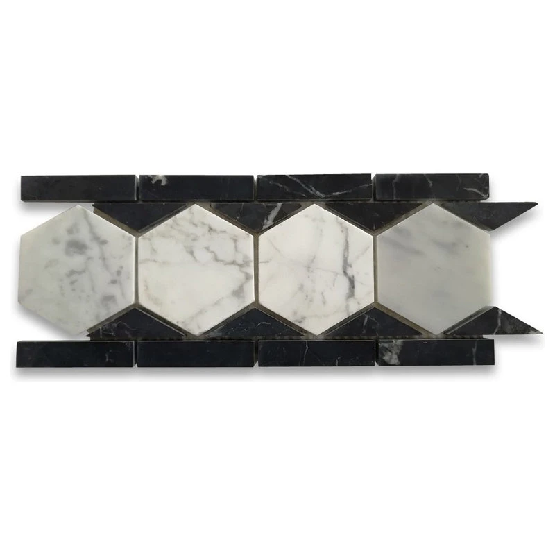 Stone Center Online Carrara White Marble 3 Hexagon Listello Mosaic Border Tile Black Honed, 1 Sheet
