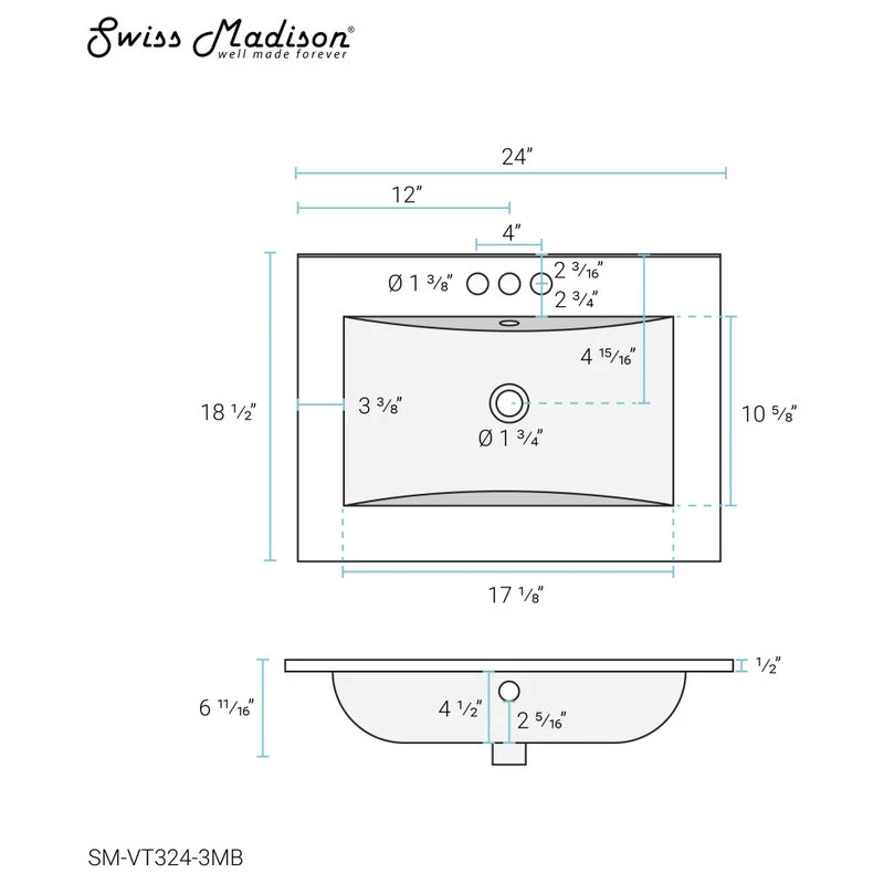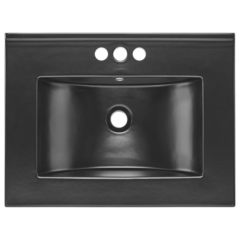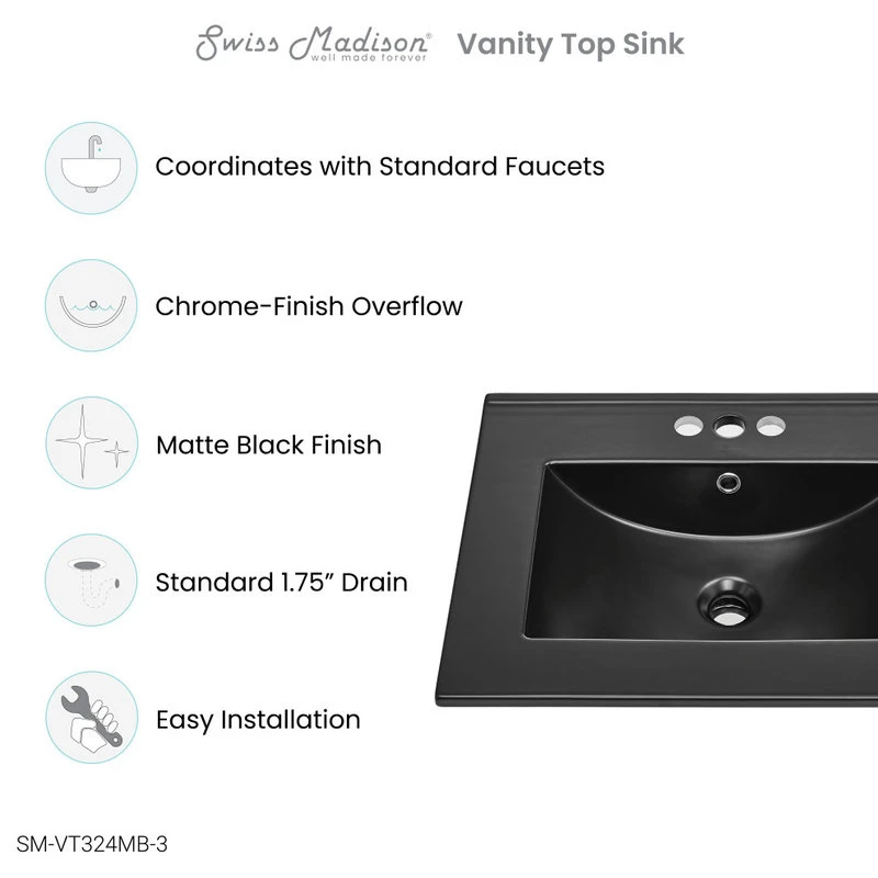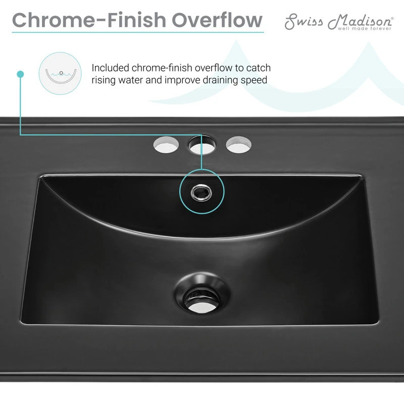 The Swiss Madison Ceramic Vanity Top Sink is ideal for larger faucet types. It’s integrated vanity top and sink offers easy instalation and a practical style. Rounded edges and high gloss shine make for an excellent addition to any bathroom.