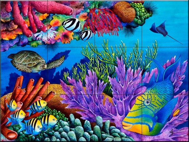 Huge assortment of fish on tiles, tile murals of fish, under water tile scenes, sea life tiles, tile murals of fish and sealife tile murals. Tropical fish tile murals for your bathroom shower tile project. Sea scene tile murals and decorative fish tile for your shower surround.