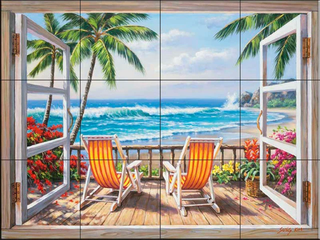 Our beach scene tile murals are great for your kitchen backsplash wall tile project. Beach tiles are also commonly used in bathroom tile projects. Beach scene tiles include tiles with beach scenes, ocean theme tiles, wave tile murals, tile murals of beach chairs and sunset tile mural scenes.