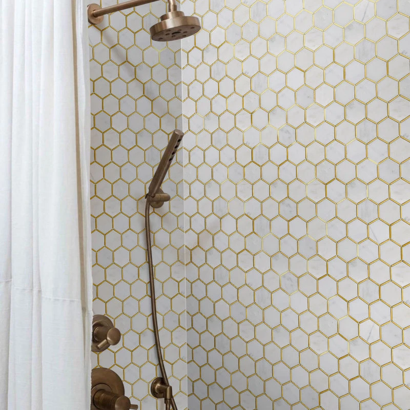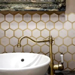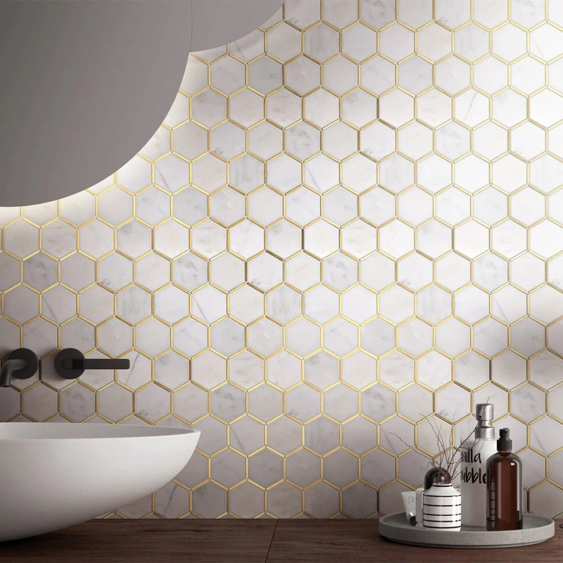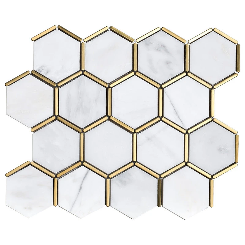 Tile Generation 3″ Honeycomb Hexagon White And Gold Metal Stainless Steel Polished Marble Tile