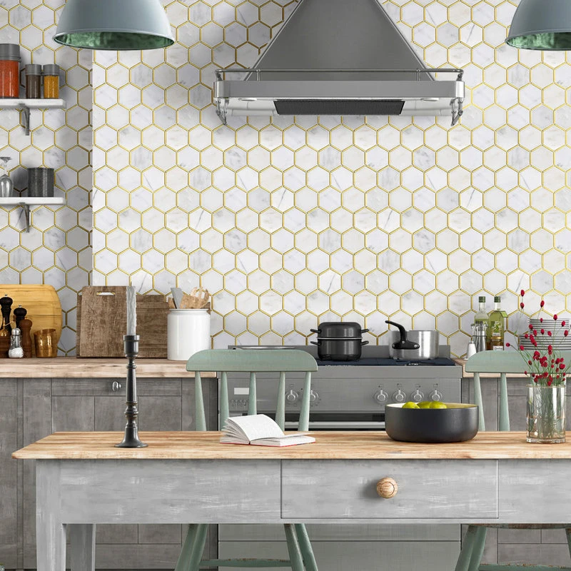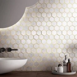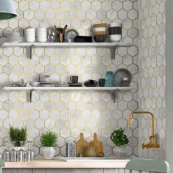 SKU: NBG-6 Categories: Mosaic Tile, Tile Tags: Hexagon white marble backsplash wall tile, Hexagonal marble tile, White and gold marble tile, White hexagon mosaic tile, White marble tile