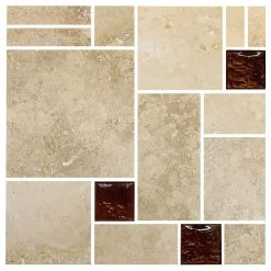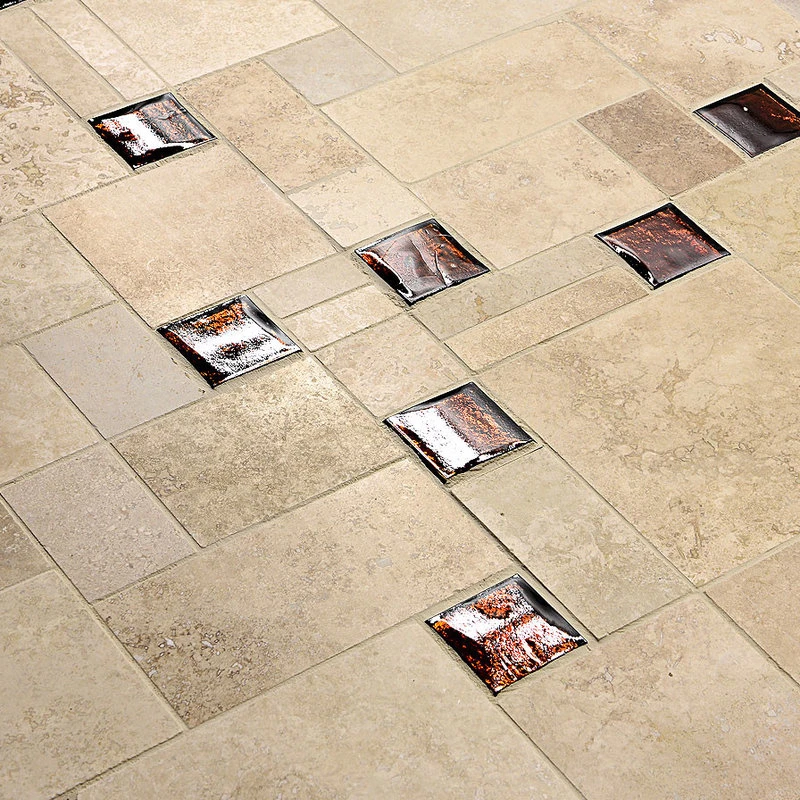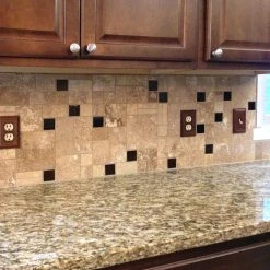 Travertine stone mixed with 2″x2″ brown glass tiles. Brown glass tile change color depends on light source. This is a unique design travertine backsplash tile for all kitchen remodeling project.