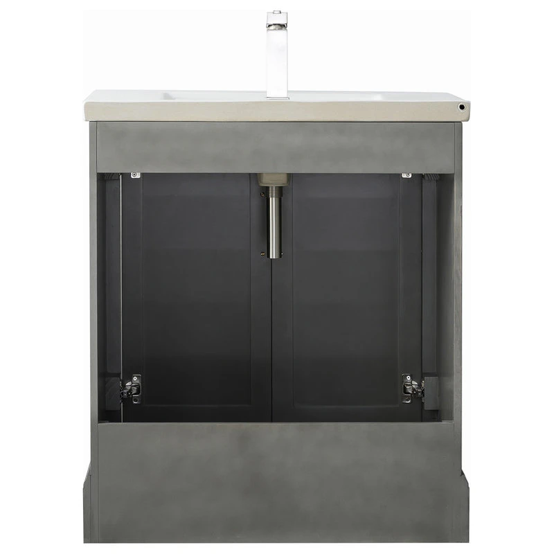 The classic clean lines and elegant styling of the 30-inch 1-hole bathroom vanity will infuse your bathroom with a calming, light, and airy feel. Designed to enhance a smaller size bathroom with a strong contemporary look with big character in a compact size. Beneath a lustrous and durable ceramic countertop is a beautifully integrated rectangular sink. Equipped with soft-closing cabinet doors with gleaming brushed nickel finished hardware, and silver-gray, white finish with a lacquer coating for extra flair and stability. Add an inviting and refreshing touch to your fashionable bathroom. Comes with a manufacturer 1-year limited warranty.