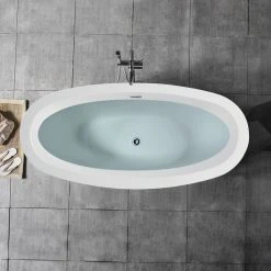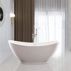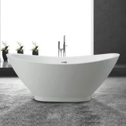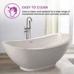 - 69″ freestanding tub with chrome pop-up drain, chrome slotted overflow and flexible drain hose