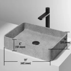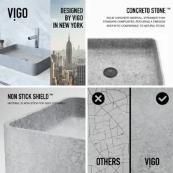 VIGO presents an elevated bathroom vessel sink handcrafted from Concreto Stone™, a mixture of concrete and naturally sustainable materials, this sink is more durable and longer-lasting than traditional sink materials. Its neutral gray color and gentle corners complement any bathroom vessel faucet, wall mount faucet, and countertop. The Concreto Stone™ Collection is ideal for traditional, transitional, and modern bathrooms.