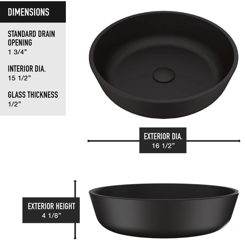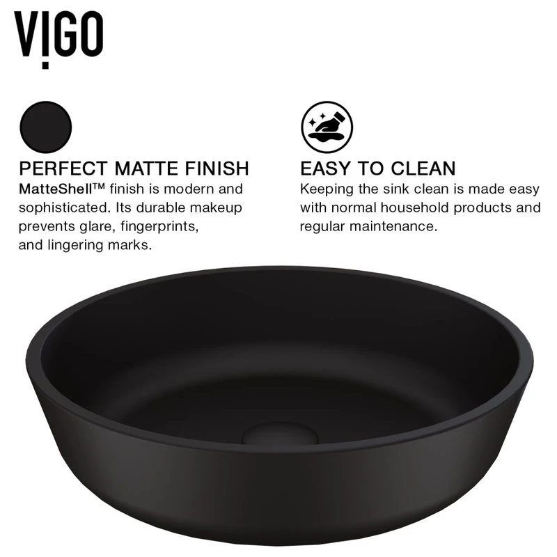 From deliberate design and pristine construction comes the VIGO Black Modus MatteShell Vessel Bathroom Sink. Innovative and intense, MatteShell sinks bring the same excellence of classic solid tempered glass sinks and take them to the next level. The Black Modus is deeply opaque and has an eggshell-like sheen that is rich yet subtle. Its deep ebony shade is infused into the sink itself, eliminating any risk of a chipped finish. The sink also has a fingerprint-free coating to prevent the appearance of marks. The Modus has a wide, round base with a relatively low profile, making it ideal for bathrooms and countertops of every size. Experience the synergy of character and style all in one with the VIGO Serato MatteShell.