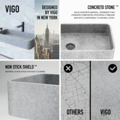 VIGO presents a beautiful bathroom vessel sink handcrafted from the Concreto Stone blend making this sink more durable and longer-lasting than traditional sink materials such as ceramic. VIGO Concreto Stone’s neutral gray color and rectangular shape complement any bathroom vessel faucet, wall mount, or countertop. Its enhanced durability ensures it remains a staple piece in your bathroom. The Concreto Stone Collection is ideal for traditional, transitional, and modern bathroom spaces.
