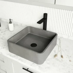 The square vessel bathroom sink set by VIGO provides a beautiful look to any bathroom space. VIGO’s proprietary Concreto Stone blend adds the longevity of natural elements to this sink. The handcrafted all-natural concrete composite is designed to withstand a lifetime of daily use, providing unparalleled durability. The Gotham single-hole bathroom faucet adds a touch of modern luxury to the set with its premium hardware finish. The included pop-up drain and mounting ring complete the set, ensuring seamless water draining.