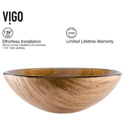 Solid, durable tempered glass construction makes the handmade VIGO Amber Sunset Glass Vessel Bathroom Sink ideal for everyday use. The polished interior and textured exterior are stain-resistant and easy to clean. With a wood-grain pattern of rich browns, the vessel sink simultaneously invokes nature and high art, raising the style bar in any bathroom.