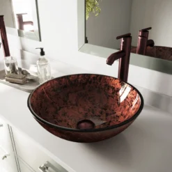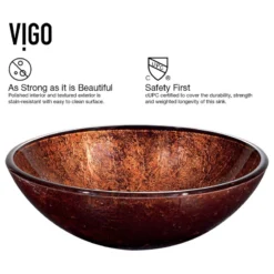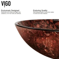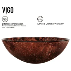 Handmade from solid tempered glass, the VIGO Mahogany Moon Glass Vessel Bathroom Sink is ideal for everyday use. The polished interior and textured exterior are stain-resistant and easy to clean. Infused with lustrous mahogany tones, the bathroom sink elevates the decor of any bathroom, whether it’s in your master bath or the powder room.