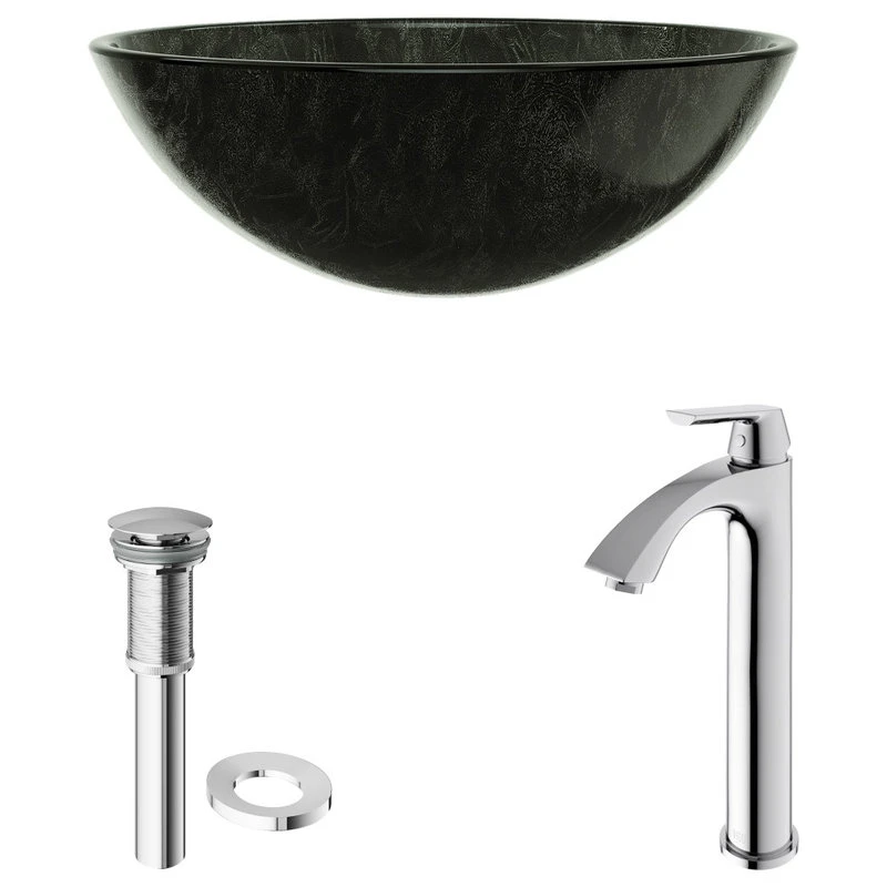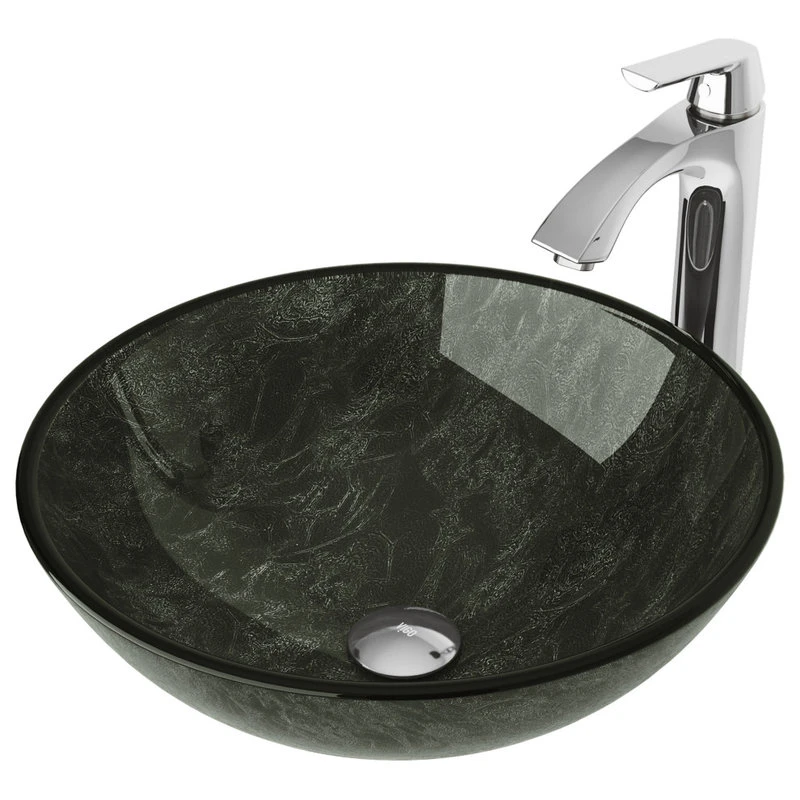 - The VIGO Gray Onyx Glass Vessel Sink and Linus Faucet Set in a Chrome Finish provides any bathroom with a unique and distinctive style.