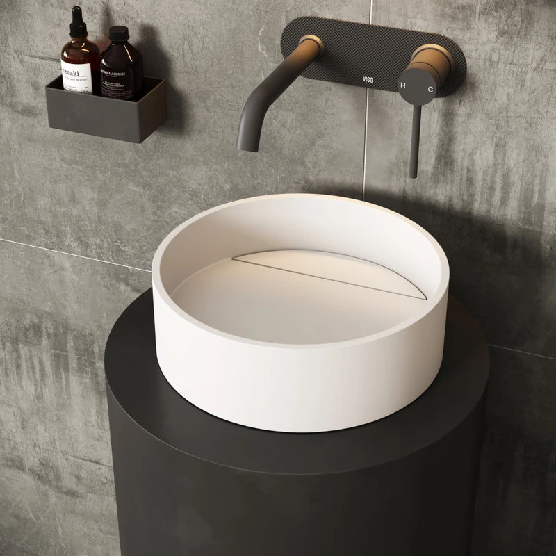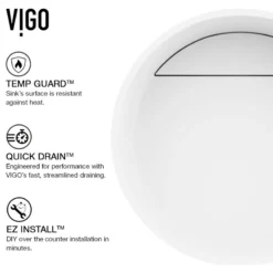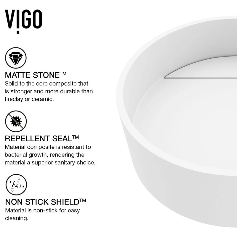 A round design shape and exclusive stone material distinguish The Montauk by VIGO. Constructed from VIGO’s exclusive Matte StoneTM material, this vessel bathroom sink is solid-to-the-core, more robust and more durable than conventional vessel sink materials like fireclay. Its unique stone material delivers a clean white color and a smooth to the touch surface. Its drain plate elegantly hides the drain and provides a flawless cleaning experience. The Montauk matches innovation with style to create a highly functional art fixture for your bathroom.