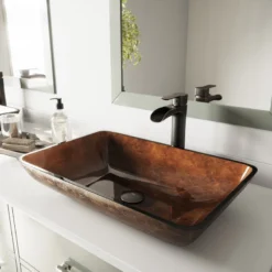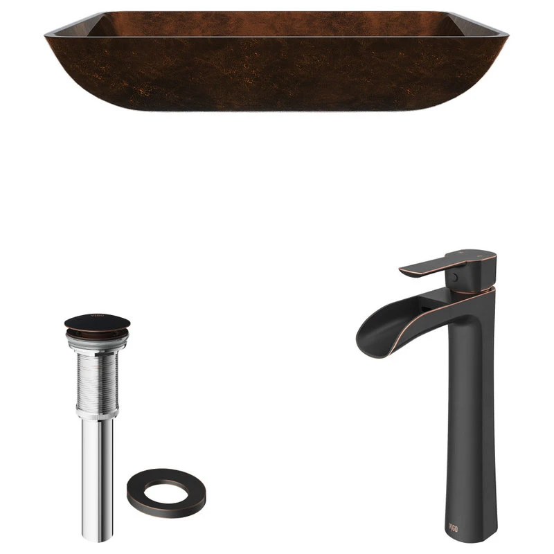 VIGO presents the Russet tempered glass vessel bathroom sink set with Niko single-hole vessel faucet in antique rubbed bronze finish. The vessel sink is made from durable tempered glass. It has a textured, scratch-resistant exterior and a polished interior, making it easy to clean. Its handmade design leaves slight color variations that ensure no two sinks look alike. It pairs perfectly with the Niko vessel bathroom faucet in a matching finish. The faucet operates at a 1.2 GPM flow rate to conserve water. The water volume and temperature are operated by a single lever, making the Niko faucet usage effortless. It includes all mounting hardware, a matching finish pop-up drain, and hot/cold waterlines for hassle-free installation.