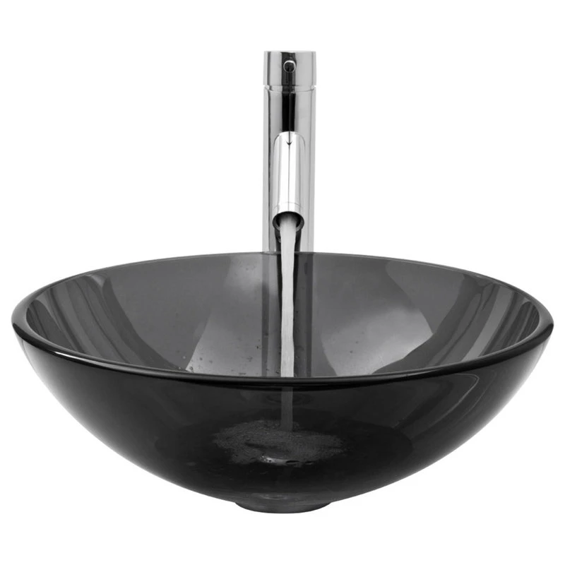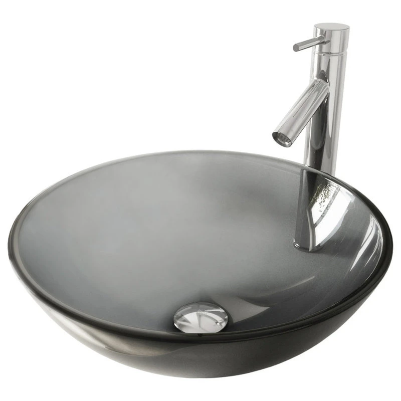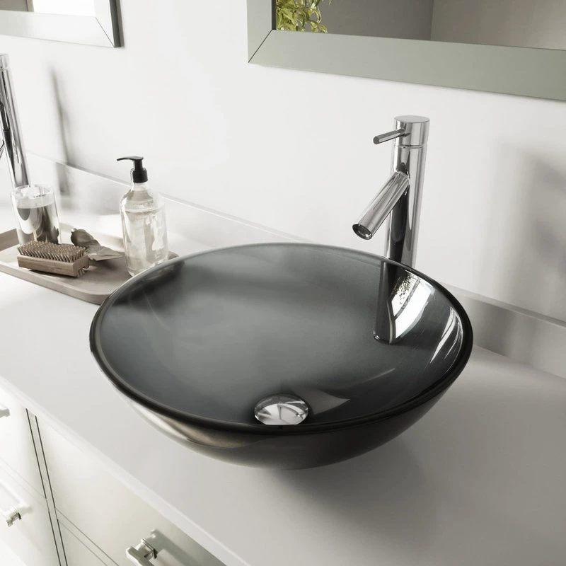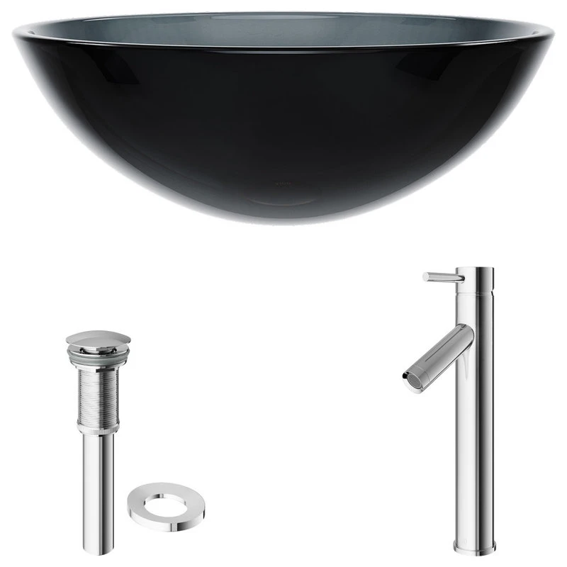 The VIGO Sheer Black round glass vessel bathroom sink with Dior faucet brings two uniquely designed products together in one impeccable combination. The hand-painted vessel sink is made from solid tempered glass, keeping it safe and resilient to dangerous shards and breakage. The sink has a smooth, polished interior and a textured exterior, which helps it withstand scratches and makes it easy to clean. The sink pairs perfectly with the VIGO Dior vessel faucet, a single-handle model with a premium hardware coating that gracefully resists wear and tear. This set will impress you with its premium hardware and a complementary, matching pop-up drain.